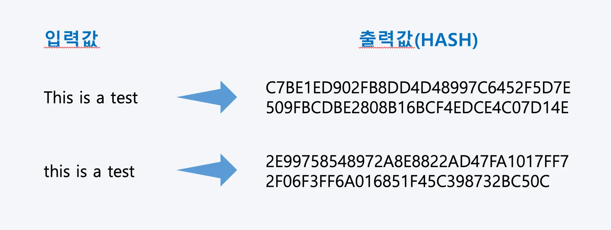 위 3가지 특징으로 인해 함수의 출력 값인 해시만으로는 원본 데이터는 전혀 알 수 없지만 원본 데이터가 조금만 바뀌더라도 출력 값인 해시는 완전히 다른 값을 가지기 때문에 이를 비교해 원본 데이터의 변형여부를 확인할 수가 있습니다.