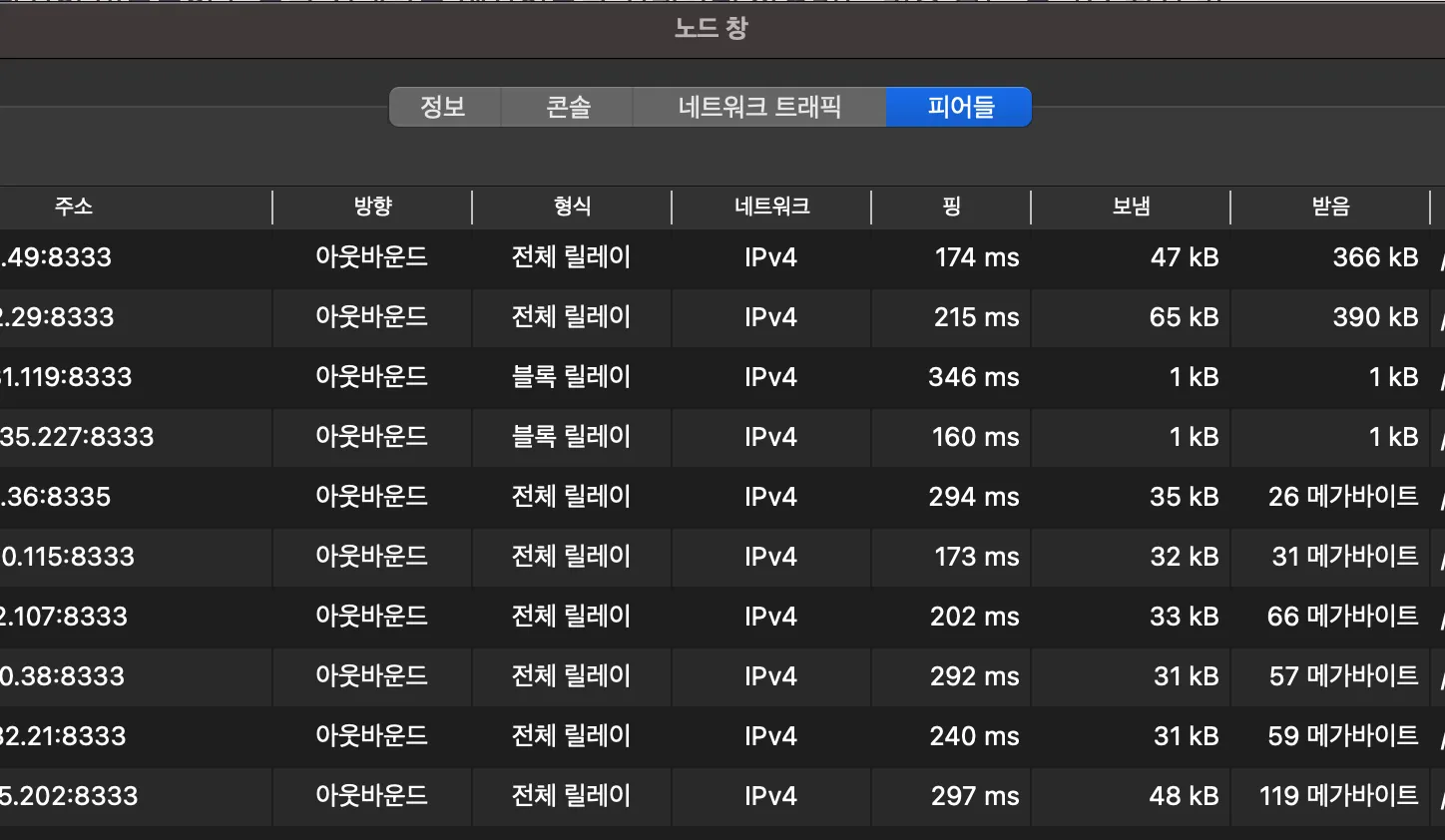 새로운 블록을 생성하거나 검증하여 비트코인 거래내역을 블록체인 데이터베이스에 저장하고 유지하는 역할을 노드(Node)라고 합니다. 여러분이 비트코인 코어 앱을 컴퓨터에 설치한 뒤 실행하여 블록체인을 동기화하고 검증하도록 한다면 여러분의 컴퓨터도 비트코인 네트워크의 노드 중 하나가 되는 것입니다. 노드는 통신 가능한 다른 노드와 P2P 형태로 통신하여 서로의 블록체인 데이터를 공유하게 됩니다.