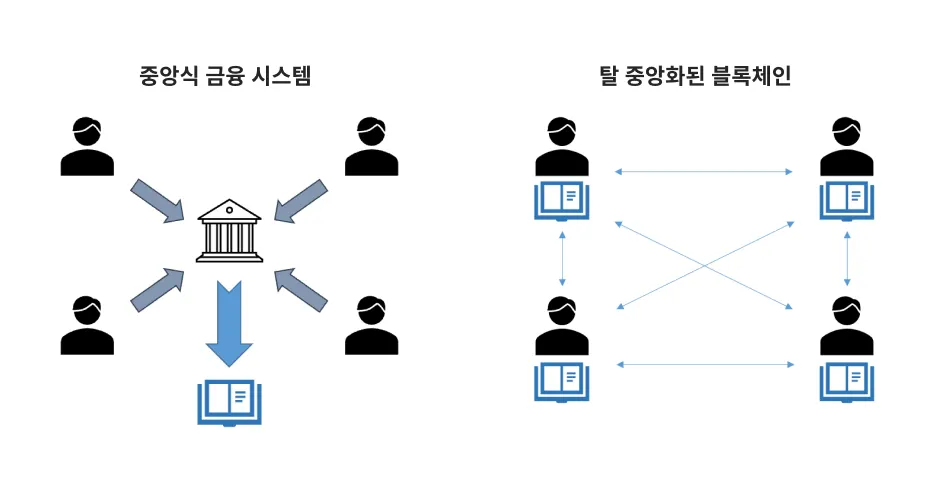 탈 중앙화된 블록체인 시스템은 거래 장부를 관리하는 중앙식 주체가 없습니다. 블록체인에서는 온전히 개인과 개인 만으로 금융 거래가 가능합니다.