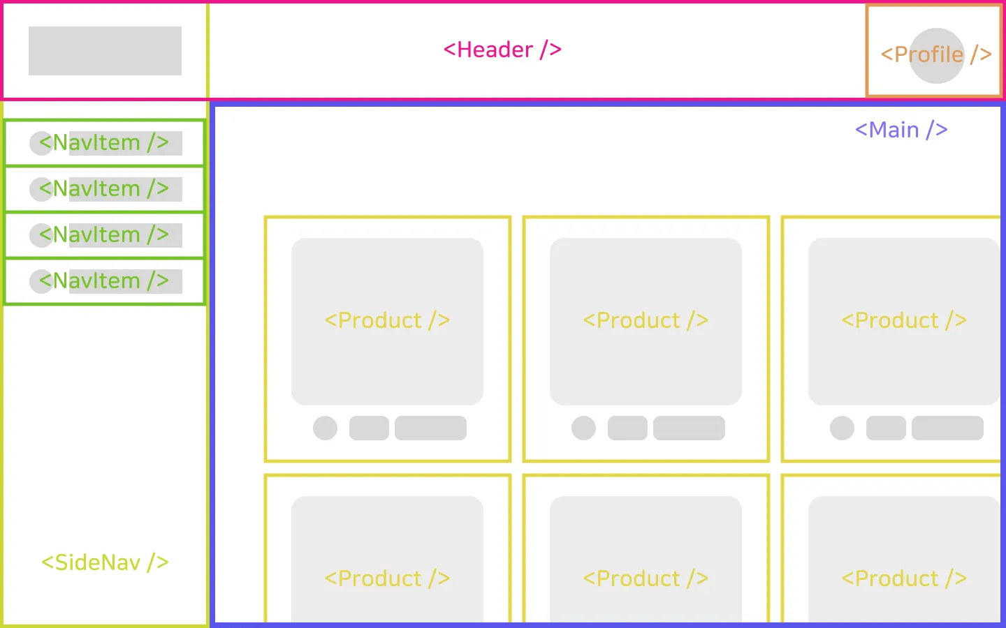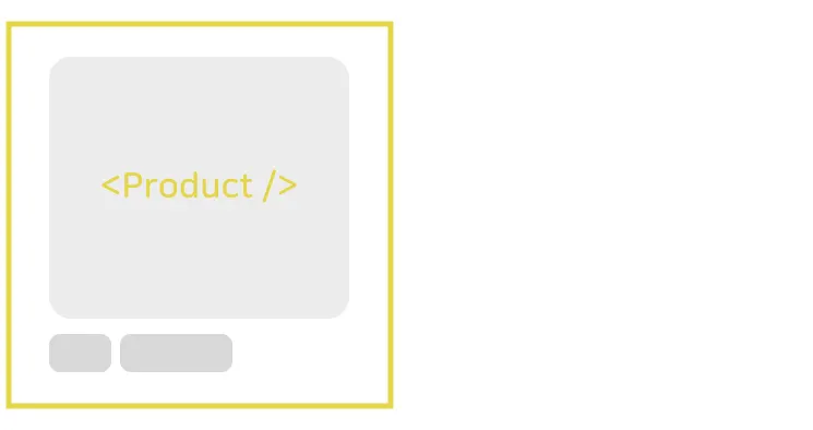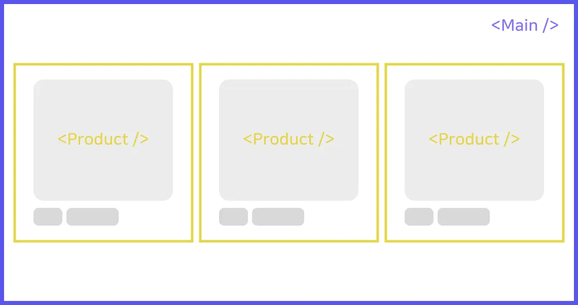 위 이미지에서 파란색 테두리의 Main 화면 영역은 사용자가 상품을 구매하는 Shop 화면이라 가정하겠습니다. 이 화면을 리액트 컴포넌트로 개발한다고 생각해 봅시다. <Product /> 컴포넌트가 각 상품의 이미지와 정보를 보여주는 상품 컴포넌트가 될 것이고 <Main /> 컴포넌트가 상품 컴포넌트들을 모두 포함해서 보여주는 컨테이너 컴포넌트가 될 것입니다. 관련 리액트 코드는 간단하게 아래처럼 작성할 수 있을 겁니다.
