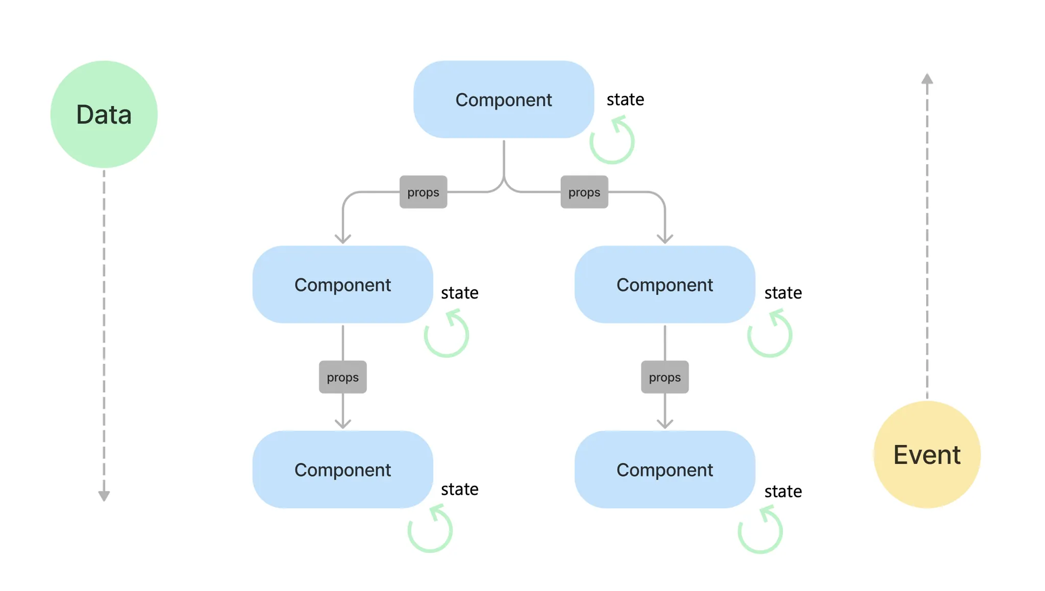 이벤트(event)의 경우는 방향이 반대입니다. 아래에서 위로 흘러가는 상향식 흐름입니다. 하위 컴포넌트에서 발생해서 상위 컴포넌트로 이어집니다. 이유는 DOM의 이벤트 버블링을 생각해보면 됩니다.