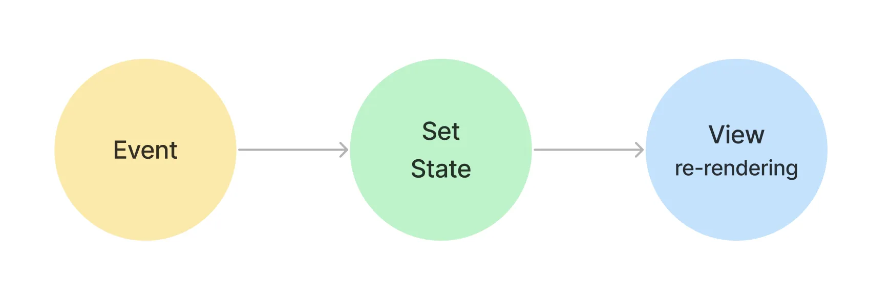 상태 관리의 과정을 간단하게 나타내자면 위와 같습니다. 사용자가 웹 화면에서 요소를 클릭하는 것과 같은 상호작용을 하게 되면 브라우저에서 이벤트(event)가 발생합니다. 이때 발생한 이벤트에 의해 상태(state)가 변경된다면 해당 상태를 사용하는 컴포넌트는 랜더링을 다시 수행하여 변경된 상태를 화면에 반영합니다.